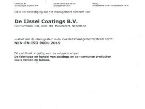 De IJssel Coatings BV ISO 9001:2015 gecertificeerd.